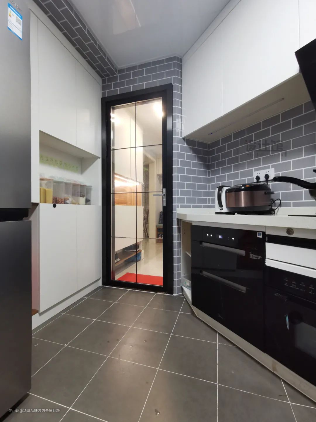 ▲厨房小空间,地砖与美缝剂颜色反差色,可以让厨房空间显得更大。