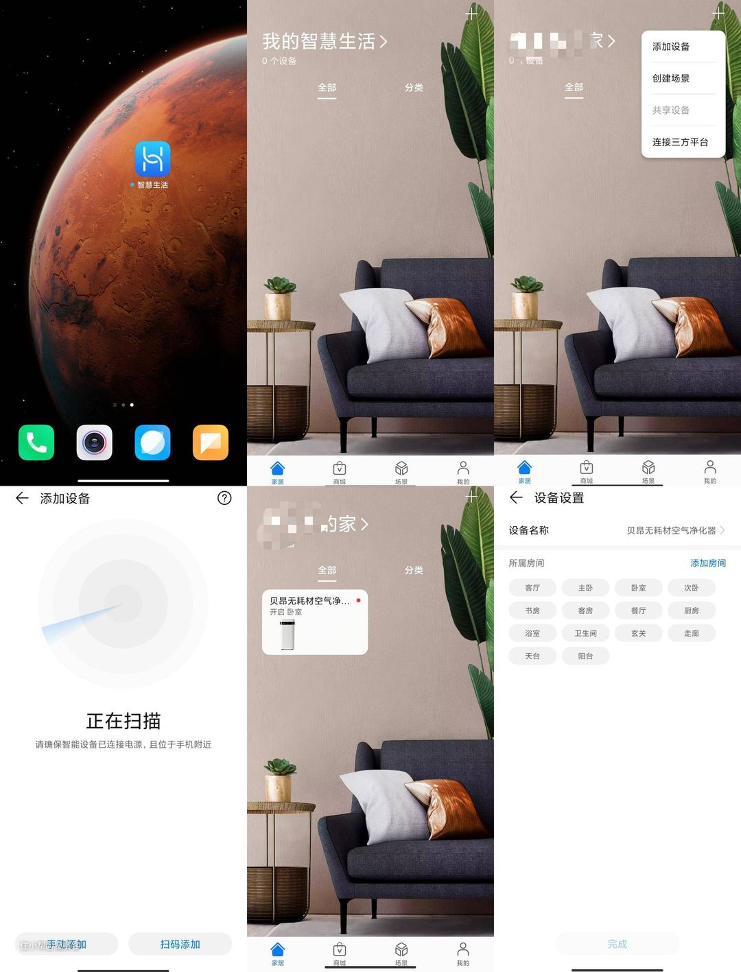 ▲下载华为的智慧生活后,根据提示很容易就能在APP中添加净化器,在APP端我们可以看到实时的空气数据,并能做更多的个性化操作。