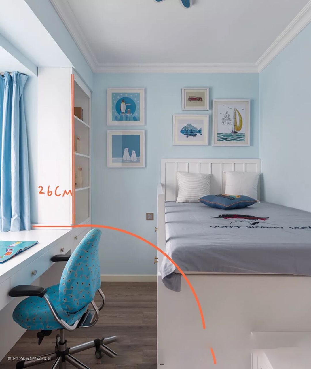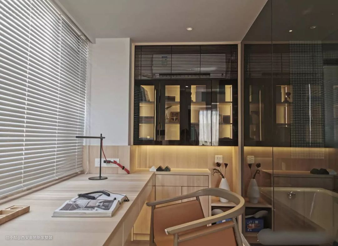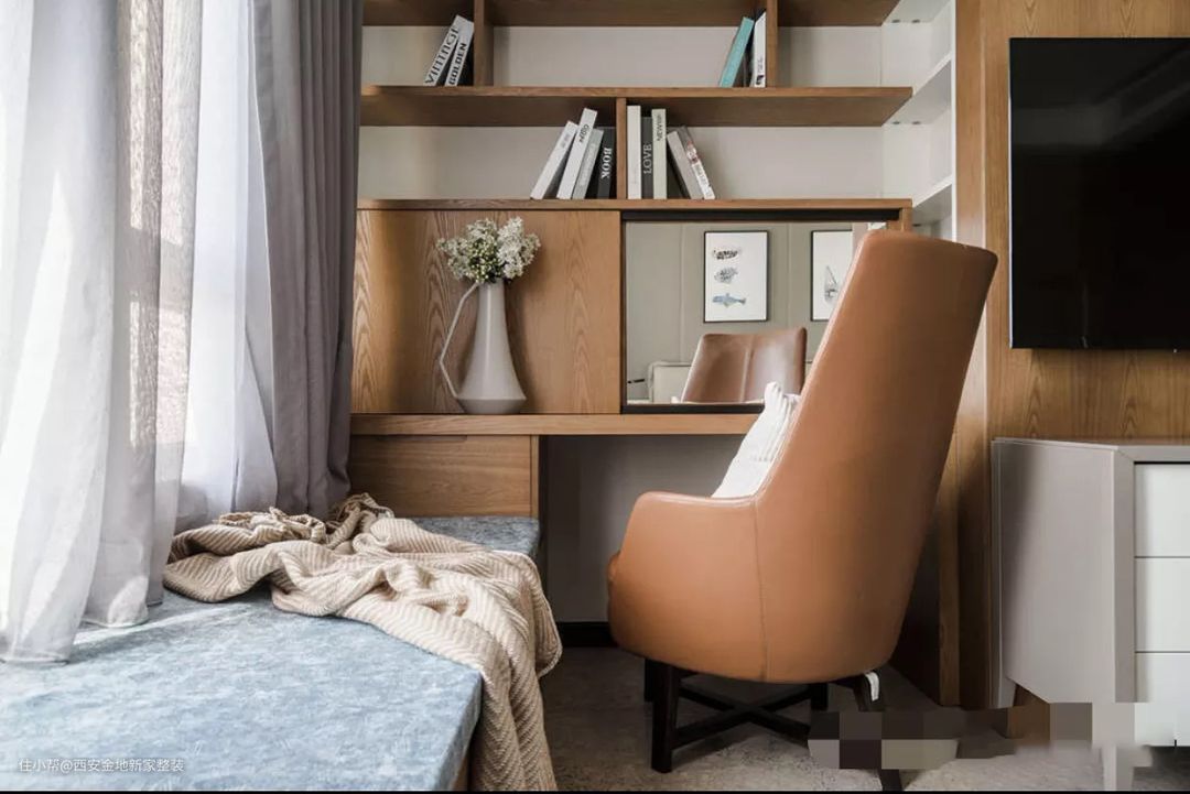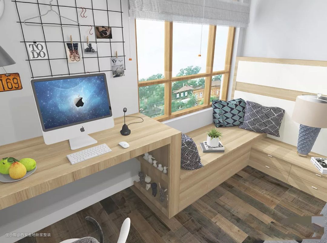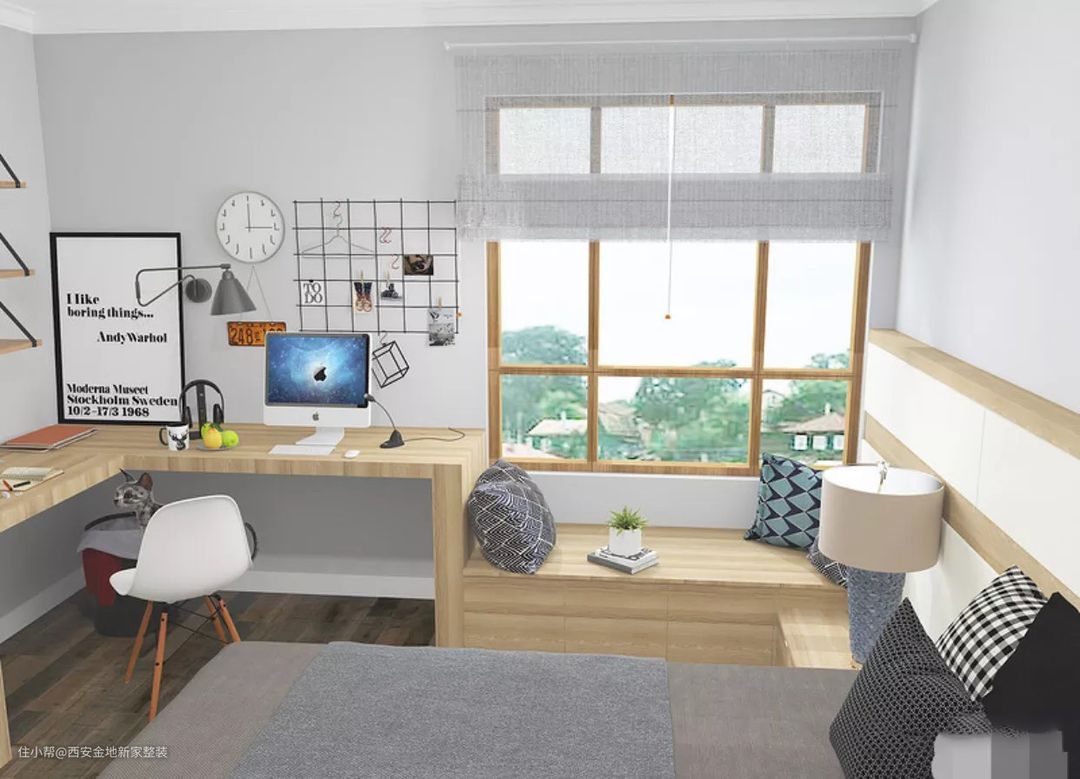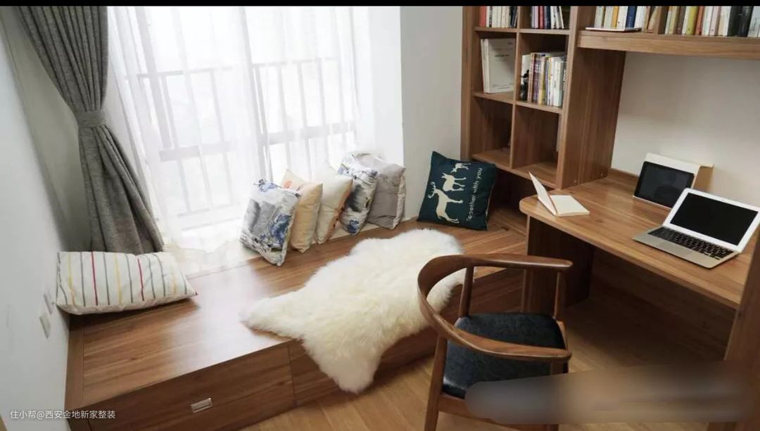 飘窗也不能砸,而加宽桌面势必会浪费空间,利用飘窗的高度,拐角打造一个书桌,也很实用。