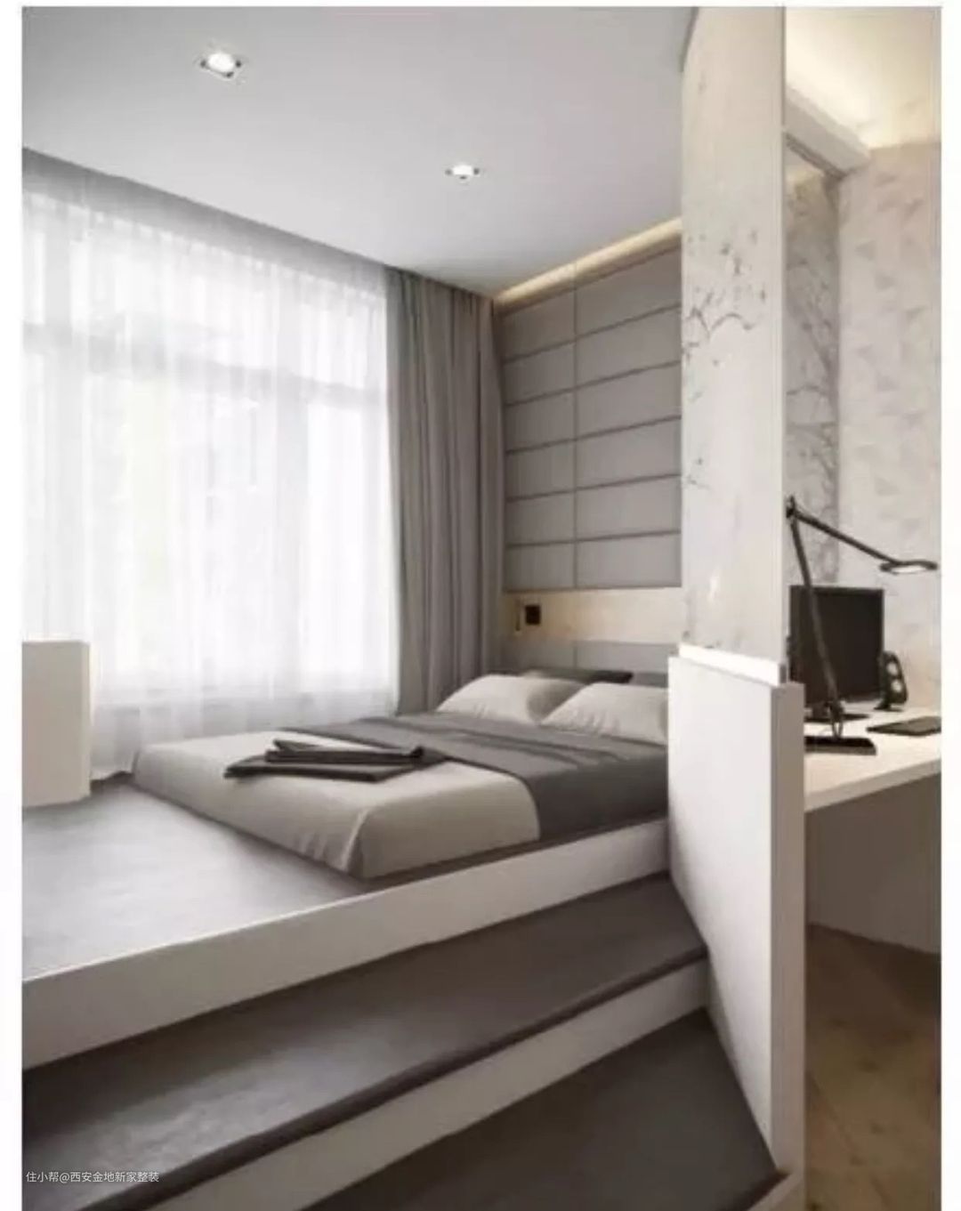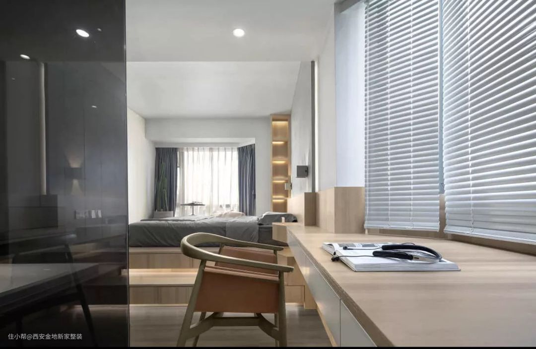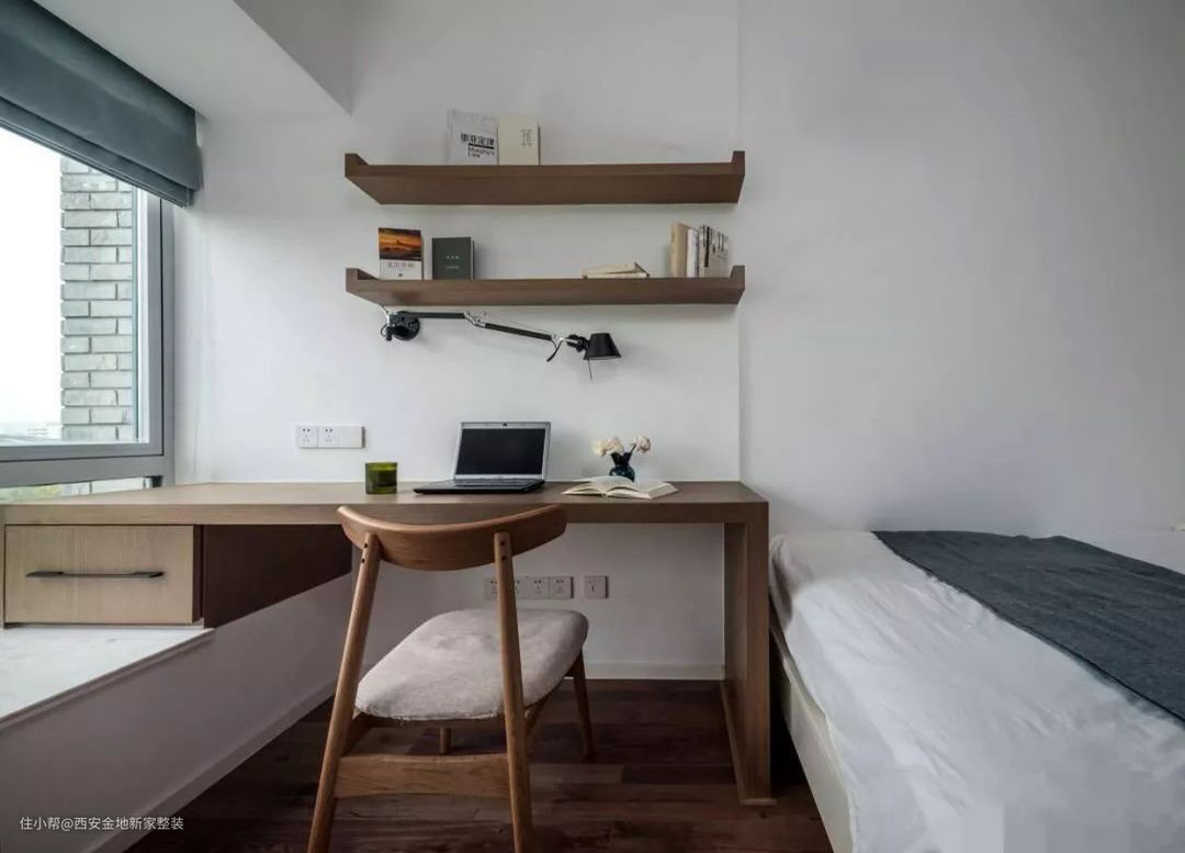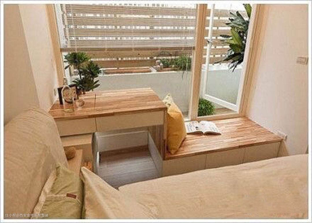 想要更大化的利用好空间,我强烈推荐大家学习利用这种“一体式”设计,飘窗、书桌、床头柜,甚至床,都有一体化设计,非常节省空间。