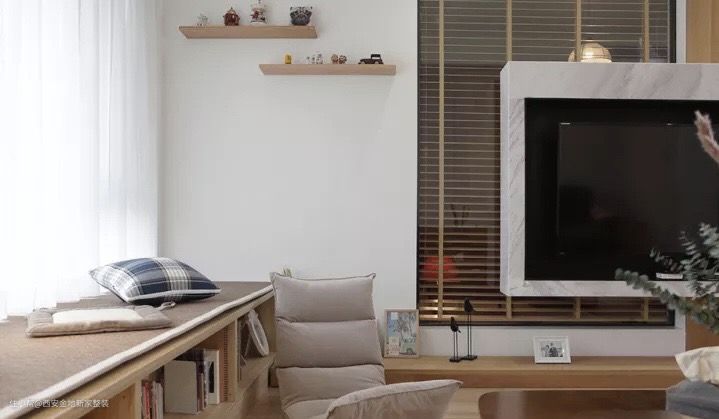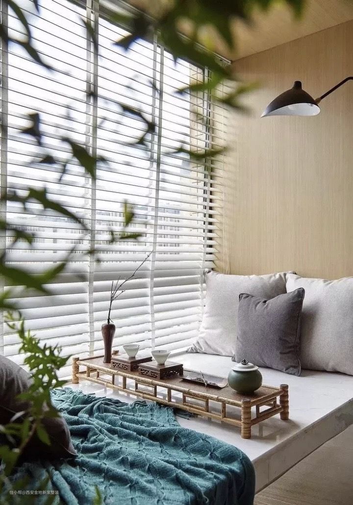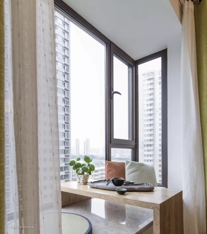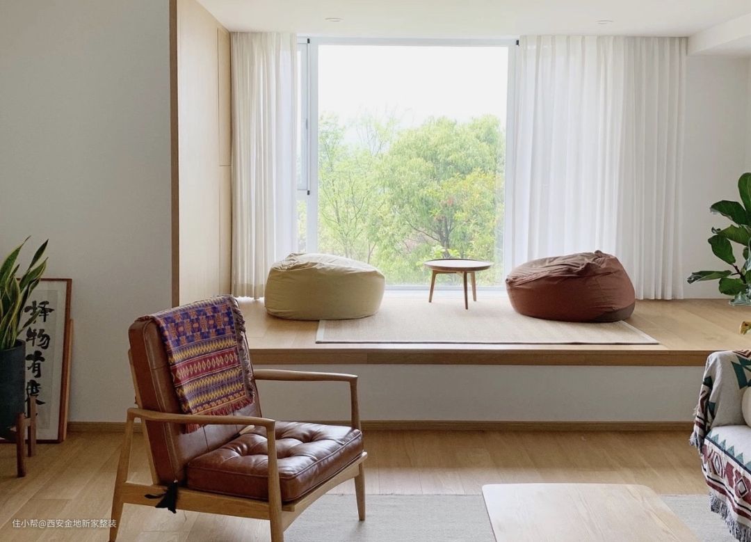 我们不妨学习日式设计,用木框将飘窗框起来,同时也将窗外的景色“框”了起来,犹如空间里的一张流动的画,坐在这里的人也将自然融入画中,营造意境。