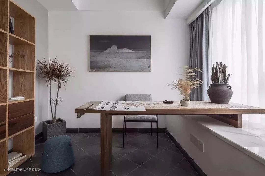 或者,将书桌直接架在飘窗上,打造小一个书房空间,在这里写写画画也很惬意美哉。
