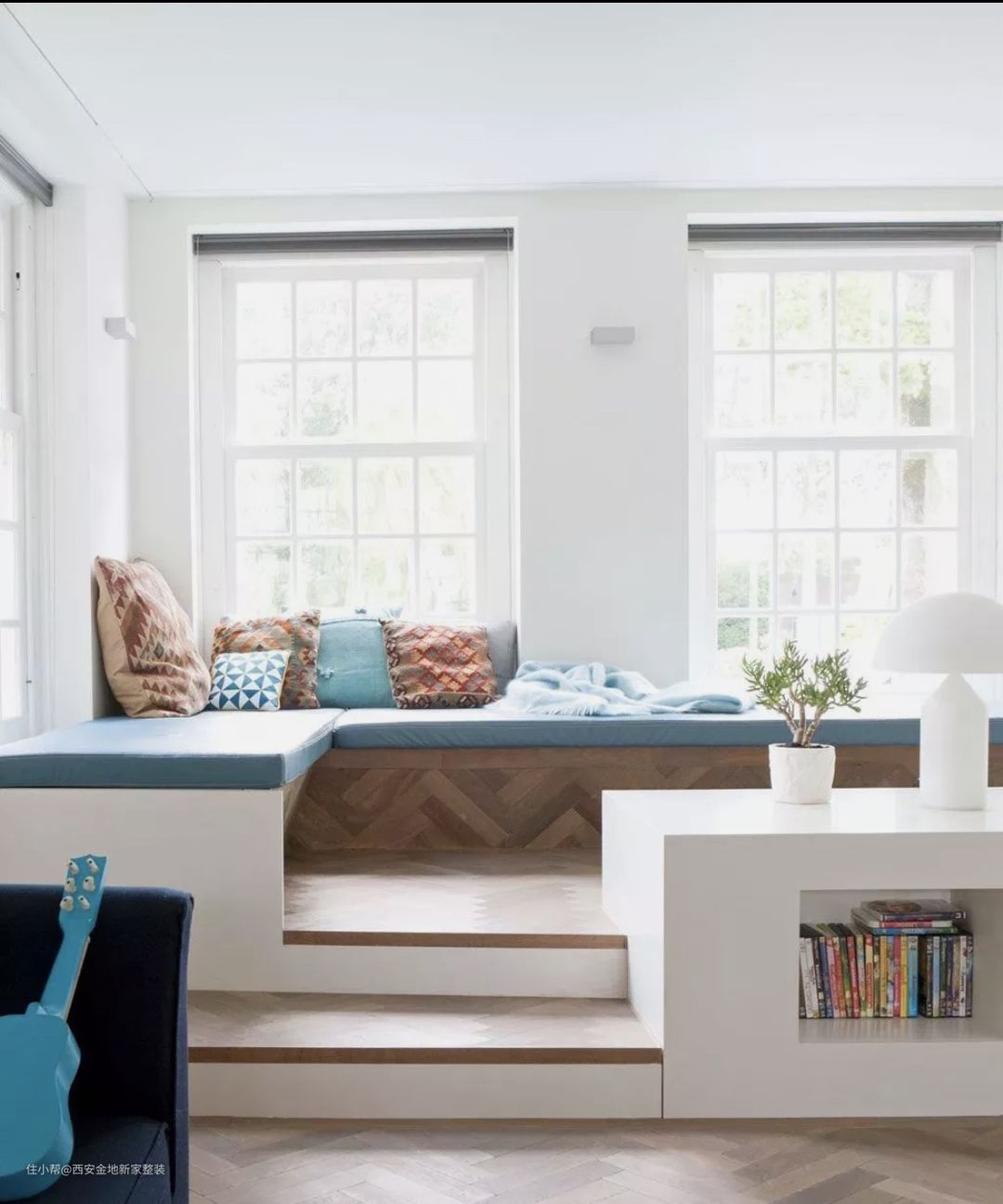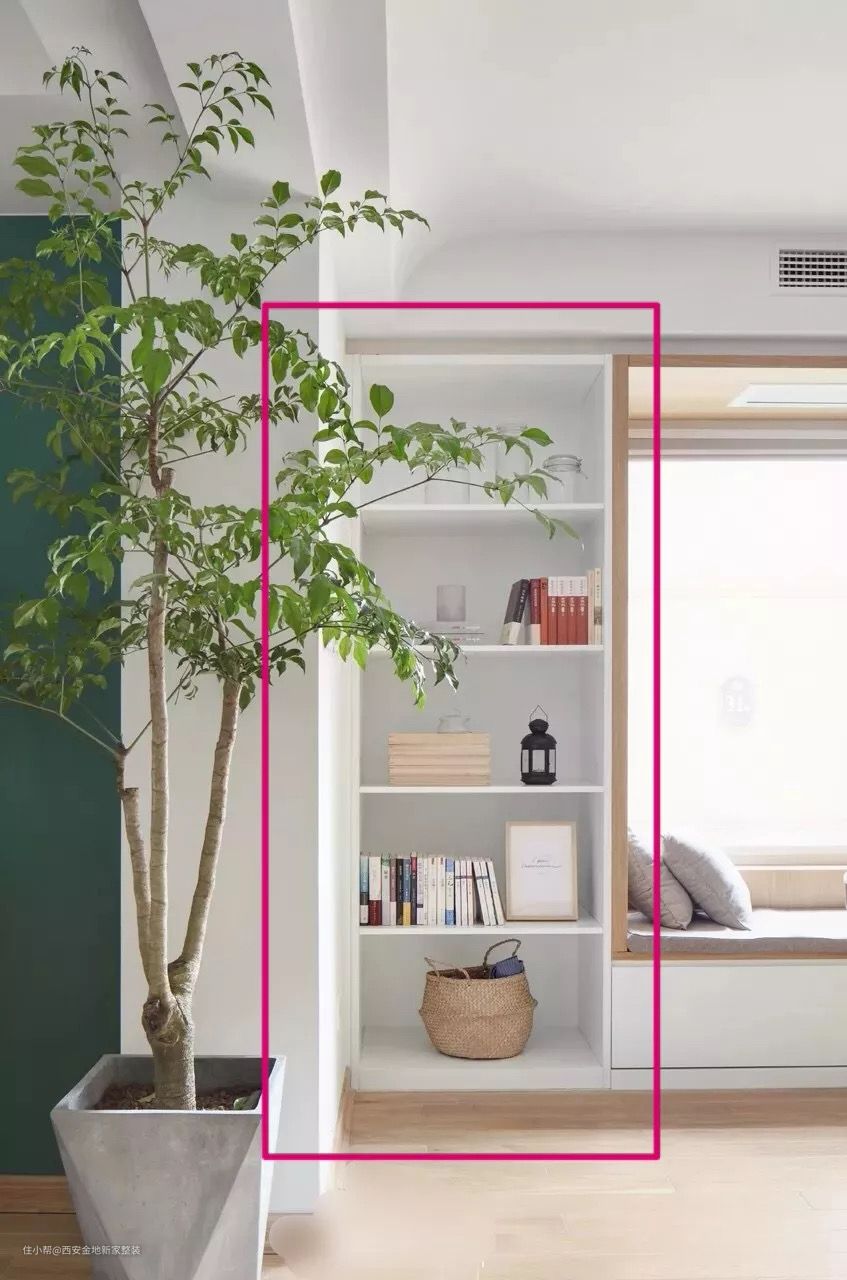 下图这个房子本来是没有飘窗的,业主希望有一个可以看书发呆的地方,于是沿着窗户定制了一个拥有储物空间和书架的多功能飘窗。