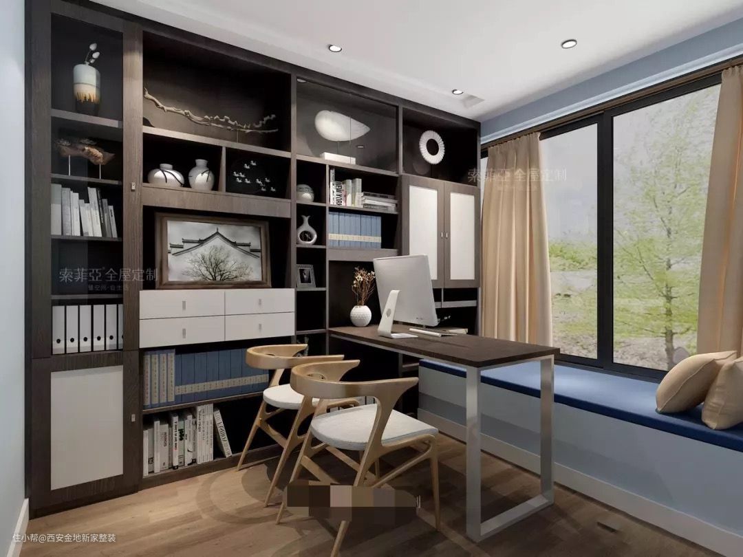 飘窗处的光线,对于工作台来说是得天独厚的优势。除了工作用的台面,同时可以在书桌旁边安装小书柜或吊柜,用于存放书籍或摆件,无论是存放还是拿取,抬手就能做到,很方便!