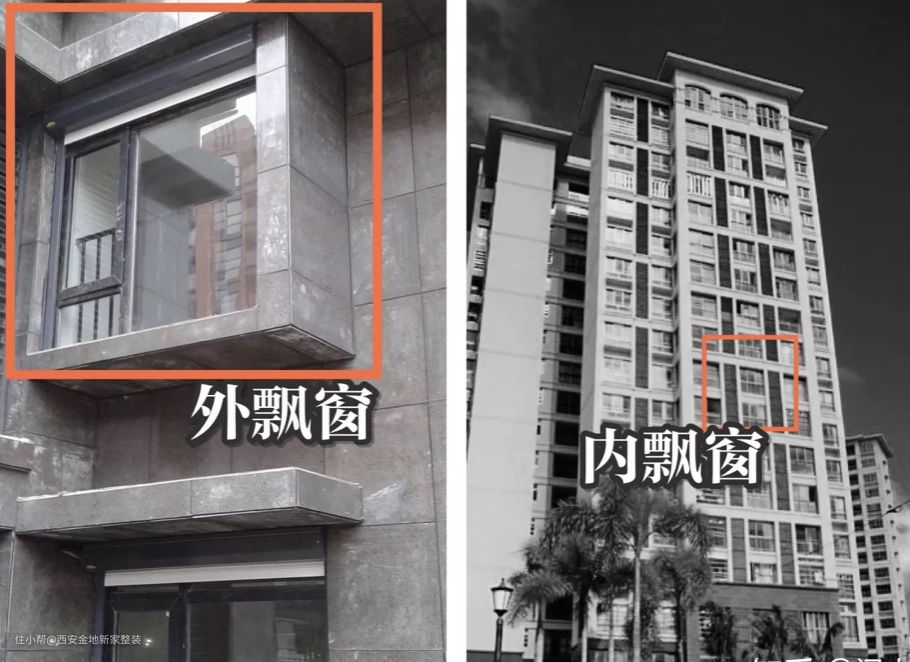 怎么区分呢?内飘窗处于室内,两边是墙,只有一面是窗;外飘窗是挂在室外的,从室内向室外凸起,呈L型、矩形或梯形。