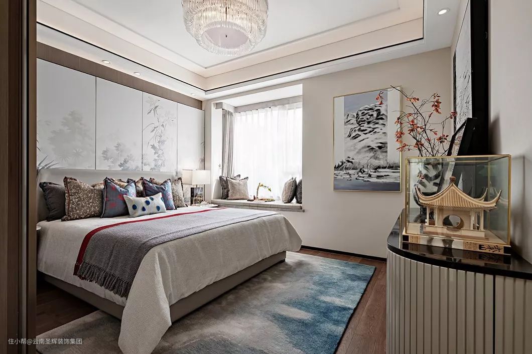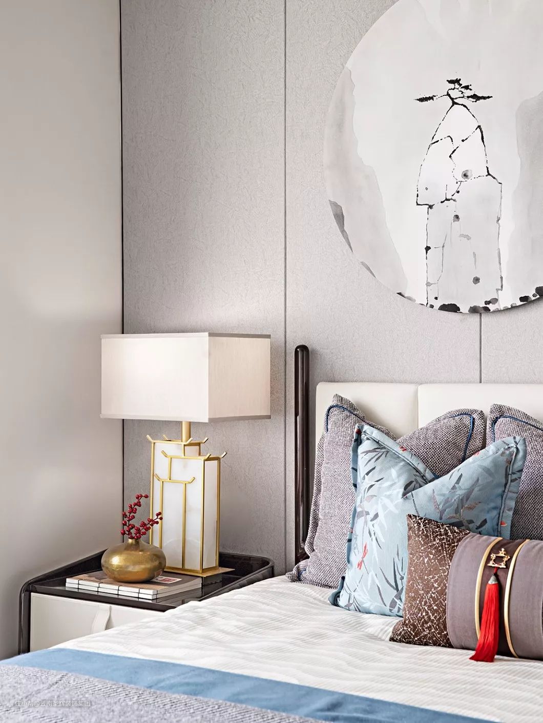 客卧的整体色调以灰白色为主,墙上的挂画远看似人,近看是山,恰当的传达出中国传统文化中只可意会不可言传的朦胧感觉。