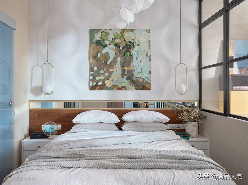 卧室的床头背景墙采用的是3D效果,给室内营造出一种流动的效果,同时也能在视觉上放大空间。柔软舒适的大床搭配床头柜,足以让人褪去一天的疲惫。床两侧还设计了对称的吊灯,供主人在床上阅读的时候使用。