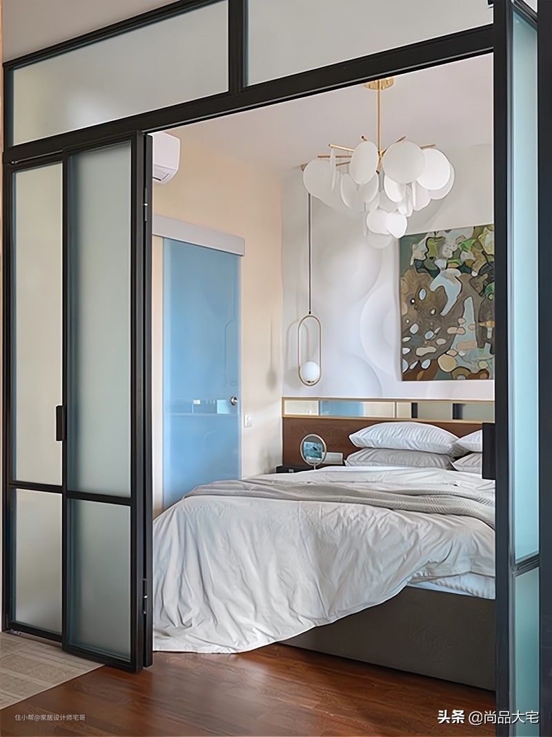 客厅旁边是宽敞的卧室,为了不影响卧室的采光和通风,卧室使用玻璃作为隔断。卧室面向餐厅这一面是入口,为了保障卧室的私密性,折叠的玻璃门全部采用的是磨砂玻璃,既不影响采光,又能很好地保障隐私。