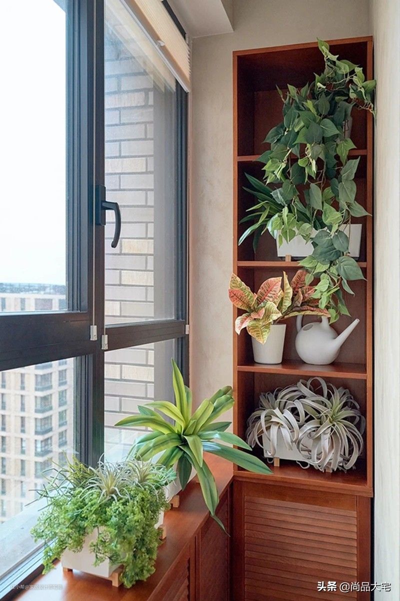 阳台靠墙的一侧设计高柜,用来摆放花草和水壶,把阳台打造成花草的海洋。