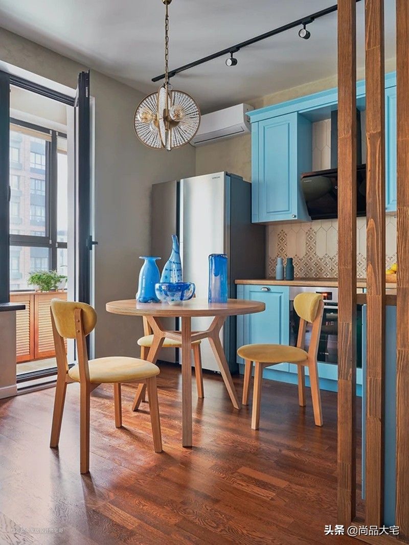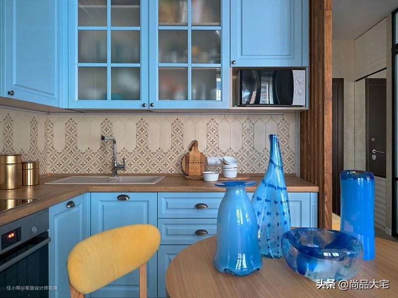 厨房电器全都采用嵌入式设计,摆放在橱柜和吊柜中,橱柜旁边留出冰箱的空间,方便使用,冰箱上方空间也没有浪费,设计了壁挂式空调。天蓝色的橱柜门和玻璃器皿与原木色系的餐桌、地板、橱柜台面用来营造一种阳光、大海和沙滩的氛围。