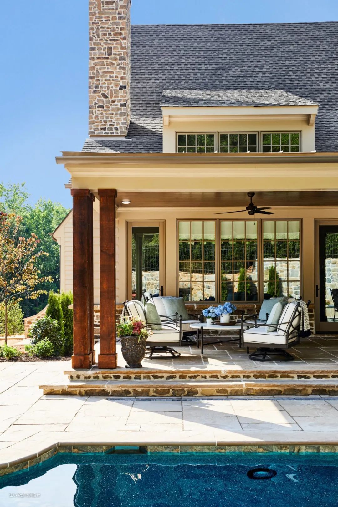 将窗户格栅涂成中性的灰褐色不会妨碍视野。在这里,它与覆盖的门廊和泳池甲板附近的所有纹理,颜色和表面紧密相连。