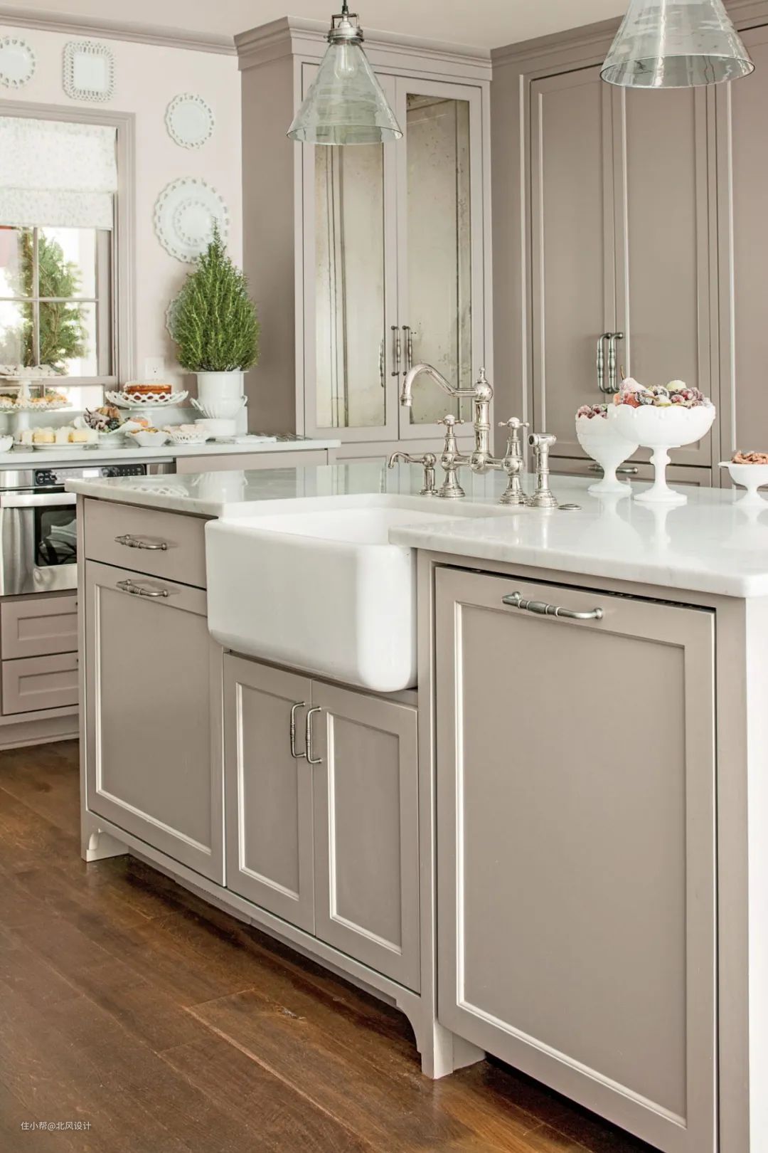 这家迷人的厨房采用旧世界元素,搭配灰色和灰褐色调,营造出典型的小屋外观。