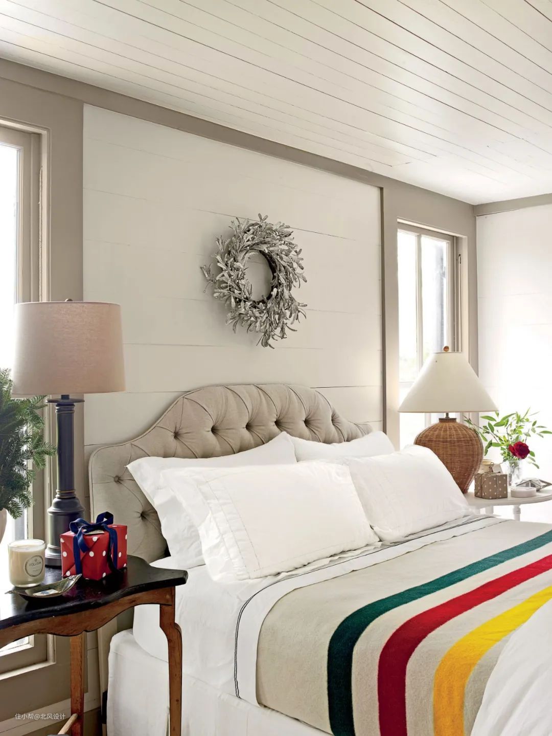 我们喜欢窗框为这间小屋风格的卧室带来的个性。为空间提供个性化的中性油漆工作是一种鼓舞人心的方法,可突出显示容易被忽视的建筑细节。
