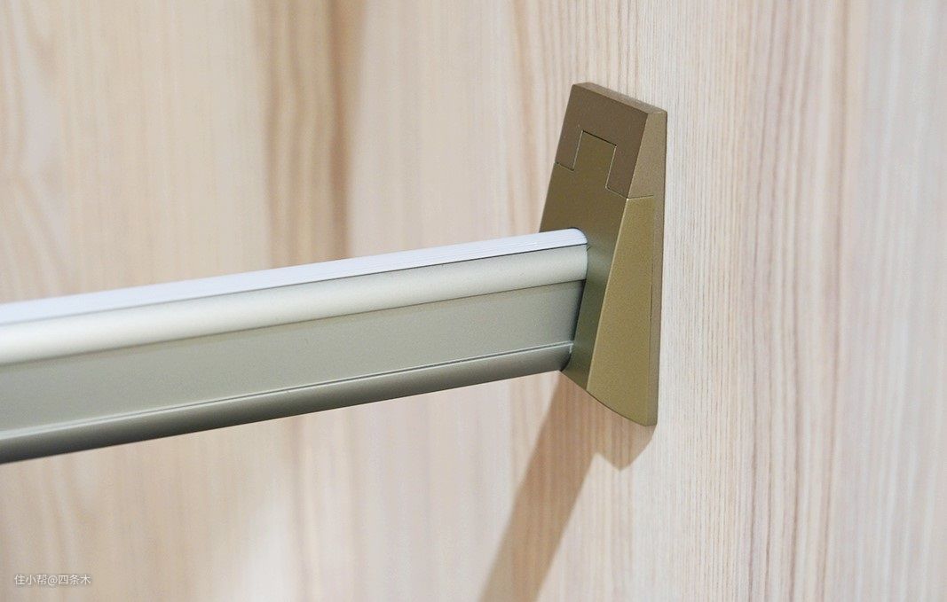 市面上衣通材质多种:不锈钢衣通、铝合金衣通、太空铝衣通、实木衣通等,建议选铝合金衣通,材质自重低、承重强,最好配防滑静音胶条。像SOGAL的衣通选用的是高硬度优质铝合金材质,硬度大,耐磨性好,长时间使用都不易变形,1米衣通可承重80斤一小时抗弯曲,实在是太厉害。并且衣通上还配了静音防滑胶条,用力滑动衣架也很顺畅,没有刺耳的噪音。