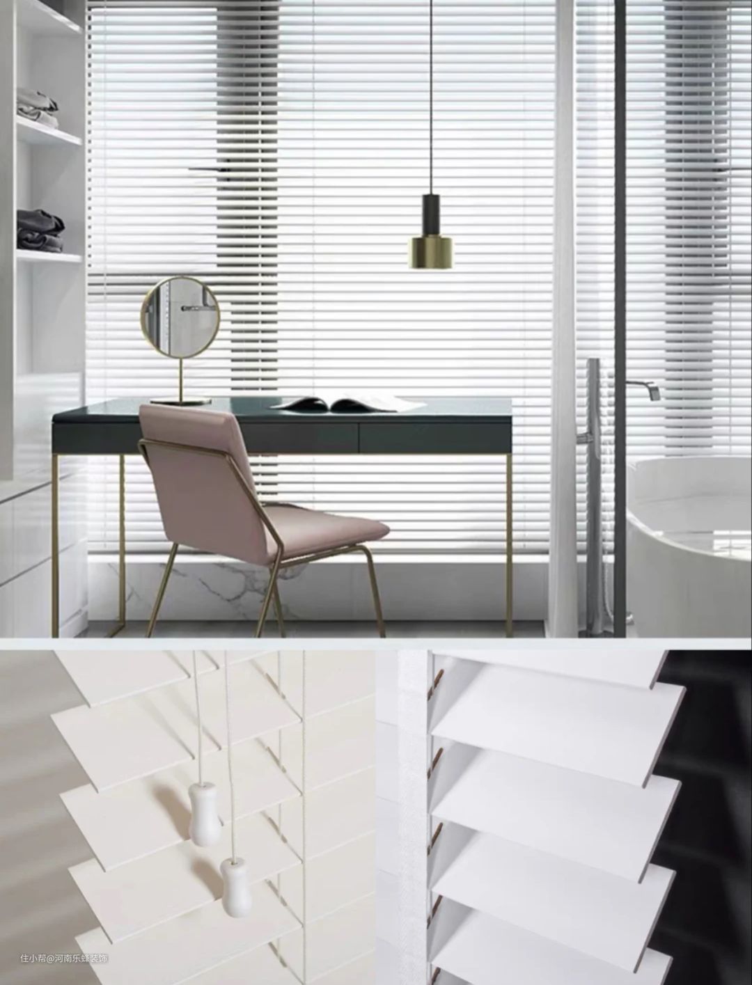 由于百叶窗帘能营造曼妙的光影效果、提升私密性、容易清洁,可以选的材质也很多,像卫生间,厨房,阳台这种易湿易油的地方也能hold住,越来越受到大家的喜欢。常见的百叶窗帘主要有以下几种: