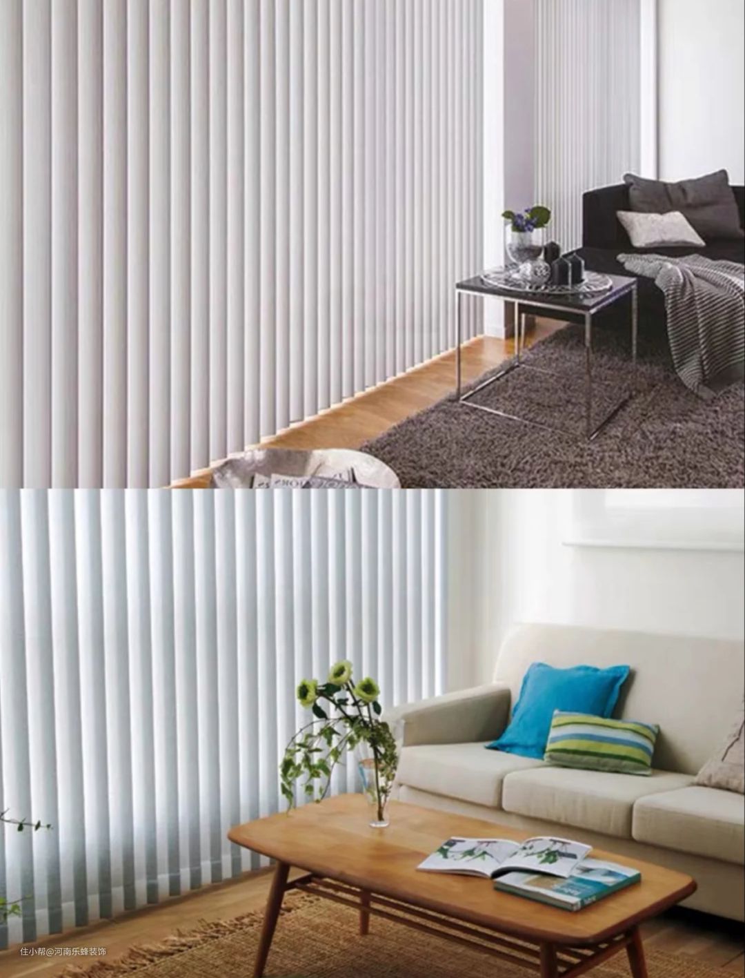 4垂直百叶帘。根据其面料不同,可分为铝片帘和布片帘。铝片垂直百叶帘适用于落地窗、阳合窗、斜角窗,帘片可选择单边折合或中分左右折合独立挂片系统,底链遇碰撞自行松脱,避免意外。布片垂直百叶帘可搭配纱帘,帘片打开时可塑造纱帘的效果。遮光和隔光布料适合落地玻璃窗,可选择左、中、右开,可随意调节帘片角度。