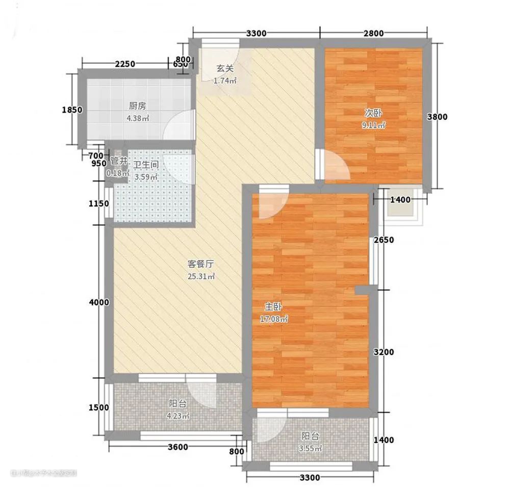 两个卧室门都对着入户门,如果有客人来做客,访客动线基本可以把房间看光。这种情况除了可以将卧室门改为朝外开,还能加个隔断。