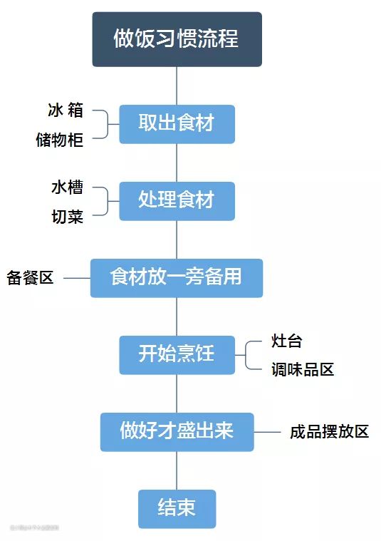 厨房的关键在于橱柜的布局,主流是L型布局和U型布局。做饭的动线流程基本是这样的: