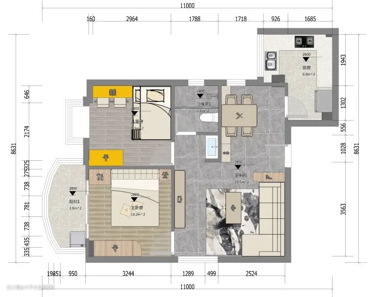 还是看上面那张户型图,明显就是动静分区不合理(公卫离卧室远,次卧在入户旁边且开门对着客餐厅),导致动线交叉、冗长,大大降低了我们日常生活的效率。