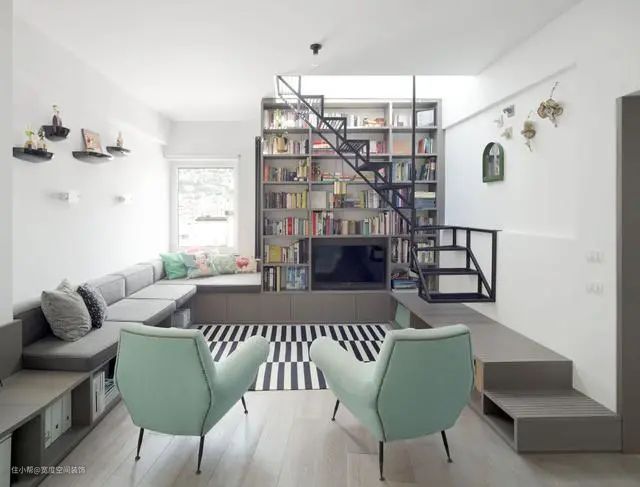 今天给大家分享的这个案例,没有遵循客厅的常规布局,而是靠墙打了一排约45cm高的矮柜,绕墙走了一圈,上面坐人下面收纳一点没耽误,连电视柜都省了,靠窗时适当加宽,加上几个舒服的靠枕、坐垫还能改成假飘窗,这难道不享受吗?