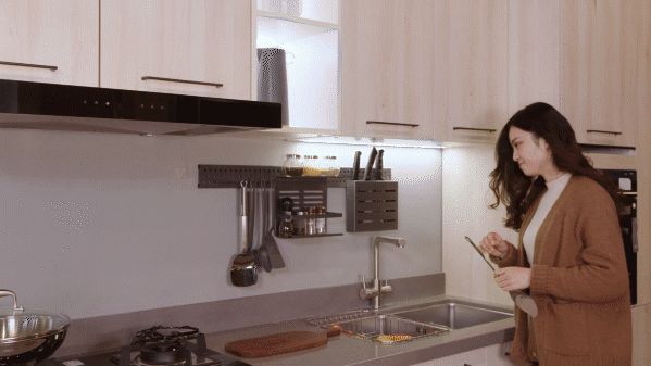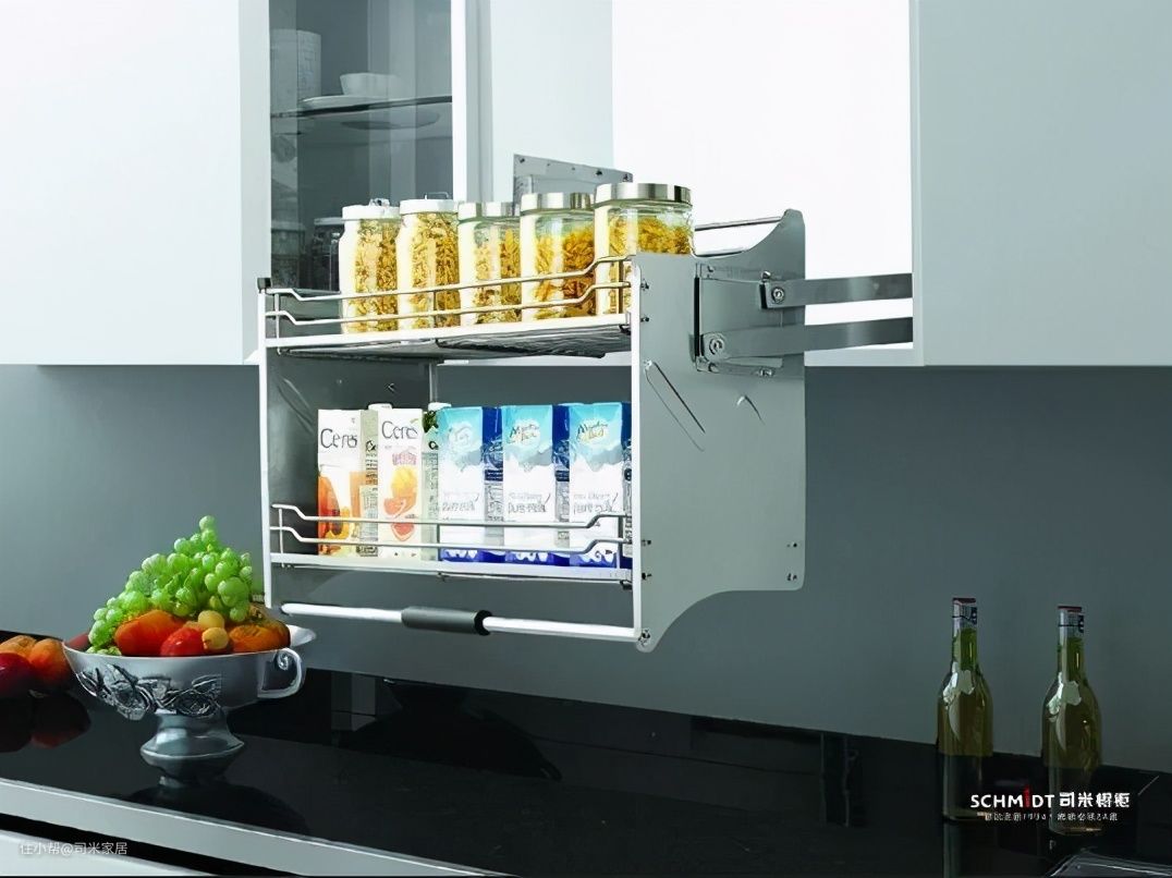 上方的吊柜由于高度原因,拿取东西会比较不方便,可以在上吊柜内部安装吊柜升降拉篮,拿取物品更轻松更加方便。