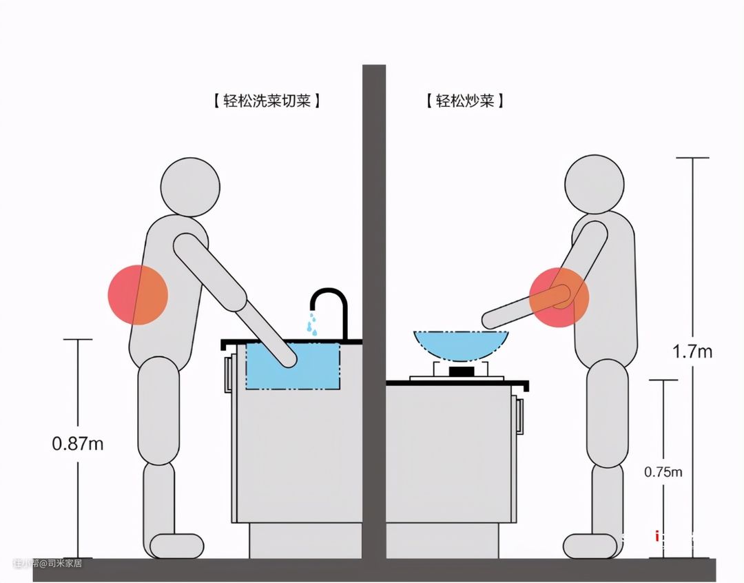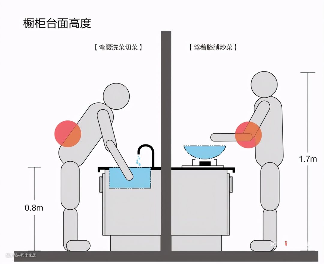 厨房用着不舒服,烹饪时腰酸背痛,很大部分原因是台面的高度没有设计好。