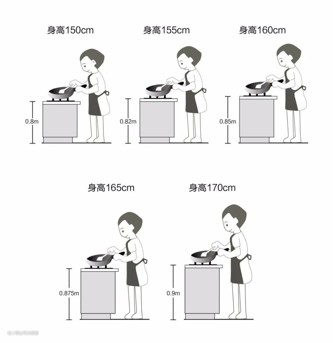 人性化的橱柜定制可以按家里下厨人的身高来定,一般是厨师身高的1/2+2.5公分左右,具体可以参照下图: