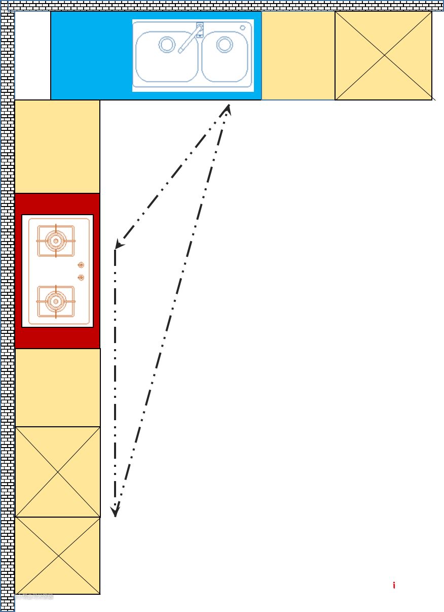 该布局可以把厨房功能区分为两部分,一部分是清洗处理材料,一部分是烹饪和摆放,两部分成“二”字型分布,可以左右操作,非常灵活。