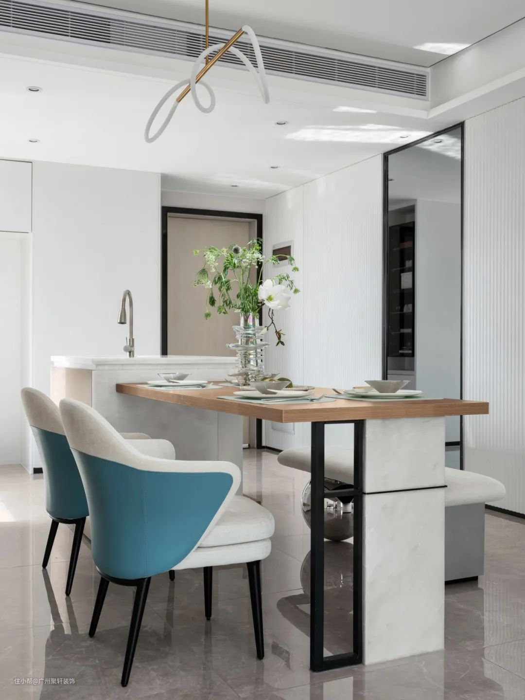 西厨台面延伸出来做吧台,既可以做早餐台、操作台使用,还可以分隔空间。