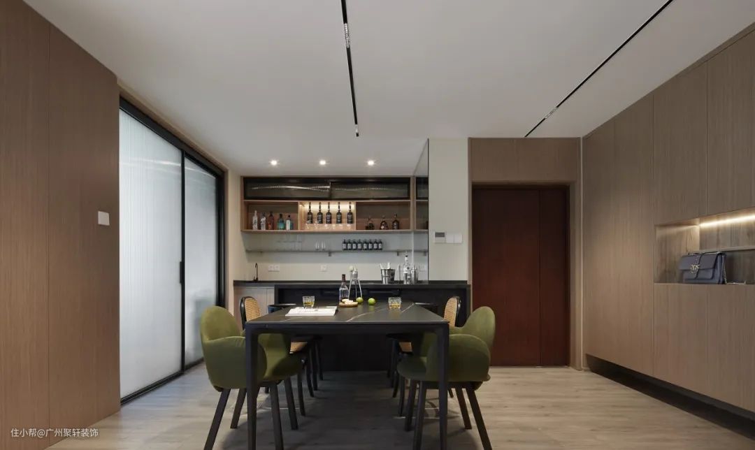 西厨开放区域,设计台面及收纳柜,电器嵌入柜体内部。中厨部分做封闭式设计,互不影响、也增加用餐区域的视觉。