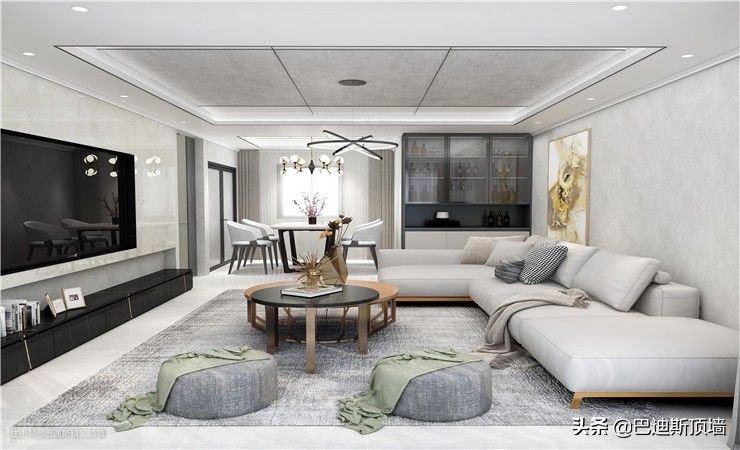 集成吊顶吊顶是分割空间手段里的一种,通过吊顶,可以使具有相同地板高度的两个相连的空间的高度不同,从而划分两个不同的区域。 例如,起居室和餐厅被天花板隔开,这不仅使两部分之间的分工清晰,而且使下部空间保持连贯和透明。