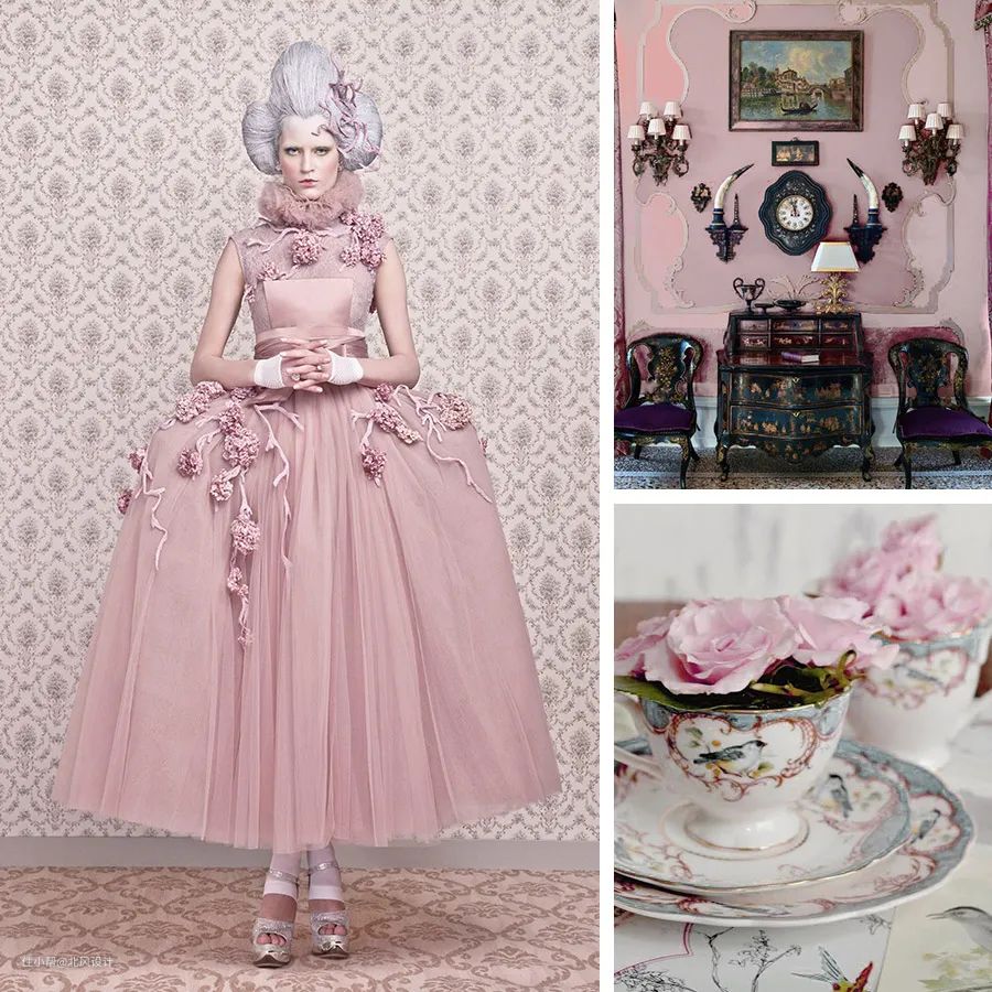 18世纪的法国,受到上层社会奢靡风气的影响,装饰手法呈现出女性主义的绝对华丽。洛可可艺术除了集中体现在建筑装潢上,在家居布艺、时尚服装领域里也特点分明。花卉主题一直受到女性贵族们的专属宠爱。在小特里亚农宫悠闲度日的玛丽皇后日常所穿皆为花卉主题,宫殿的装饰风格更加女性化。因此,洛可可文化艺术的重要表现,还包括了家居装饰的布艺成分,以紧密缠绕的花卉为主。