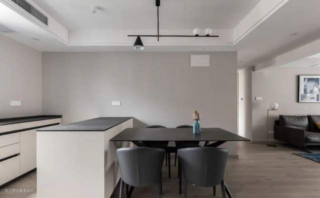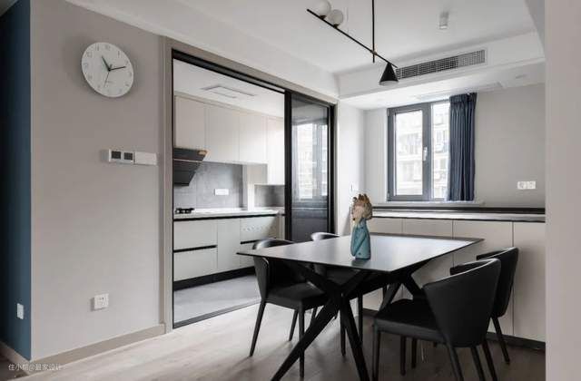 餐厅、厨房都是黑、白、灰为主,干净简约。将厨房的进门加宽,让操作空间更加开阔。黑框移门加黑玻的设计,质感非常好,也显得特别高级。