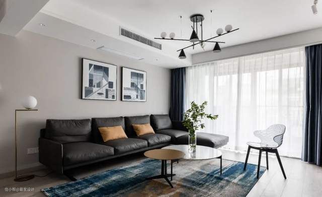 儿童房采用带有灰调的蓝色,干干净净,蓝色属于安抚色,孩子在这样的空间里会得到安全感,窗帘、床品选择明黄色做点缀,孩子非常喜欢。