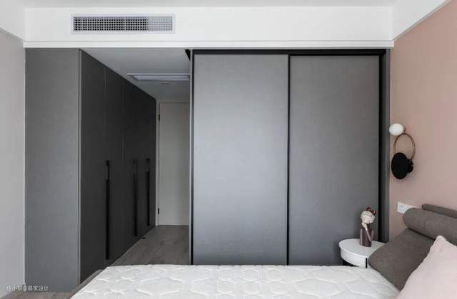原本的主卫正对着卧室,女主人觉得居住体验不是很好,设计师利用了这个房型问题,顺势将衣帽间作为缓冲,设置在主卧和主卫中间,既解决了门对门的问题,又增加了收纳。大概3㎡的步入式衣帽间,能够存放大量衣物。