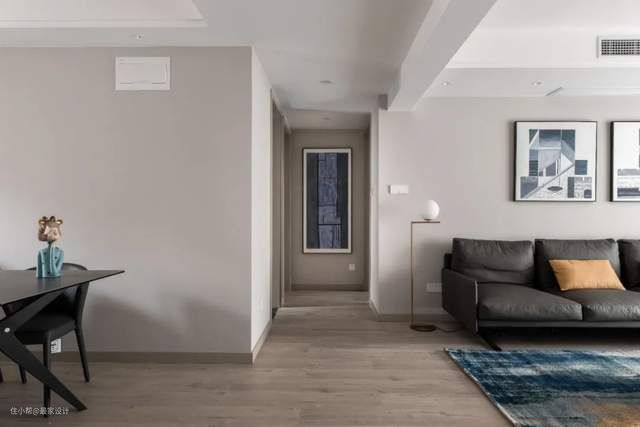 整个房子都采用莫兰迪色系,客厅的主色调是灰色,主卧则是加了灰度的珊瑚红,低饱和度的颜色增加卧室的亲和力,大面积使用也不会落入俗套。
