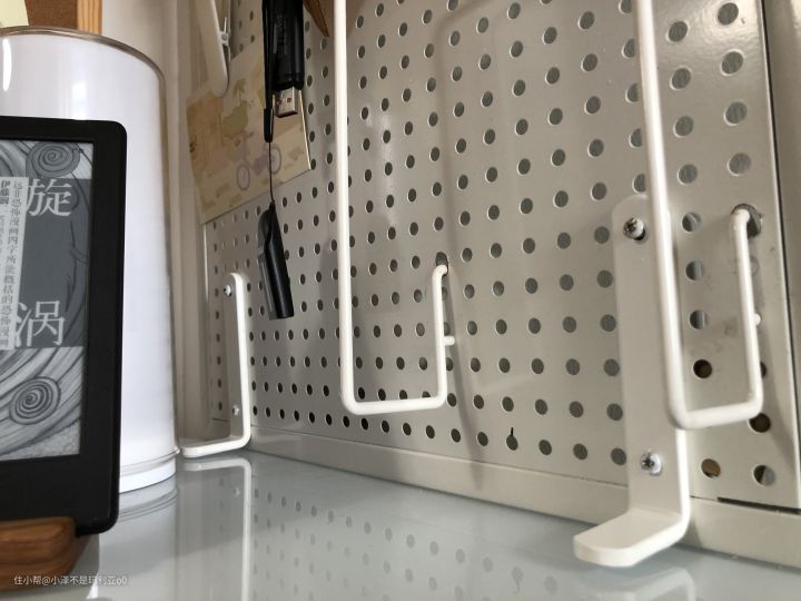▼洞洞板本来是准备打孔安装的,后来在逛宜家的时候偶然发现了这个洞洞板支架,买回来后竟然和家里的洞洞板完美适配,只需要将洞洞板夹在桌面边缘就可以固定,省去了墙面打孔的麻烦。