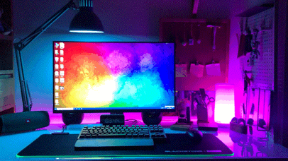 ▼为了能够让夜晚的桌面更加丰富多彩,小泽买了几条灯带分别粘在显示器后面和书桌内侧,来制造更加浓重的氛围感。