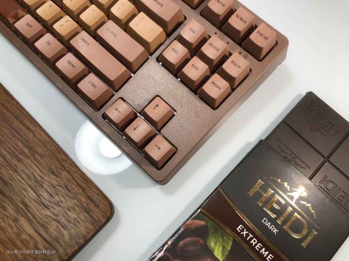 ▼购买这款键盘的主要原因当然是颜值!小泽本身真的超级喜欢吃巧克力,这款键盘不同颜色的键帽让我想到了最喜欢的牛奶巧克力,可可巧克力,黑巧克力~每次打字的时候都感觉像敲在巧克力上,经常打着打着,肚子就饿了。。。由于是设计师款,字母键帽上印有代表四季的花纹,细节方面的表现十分到位~