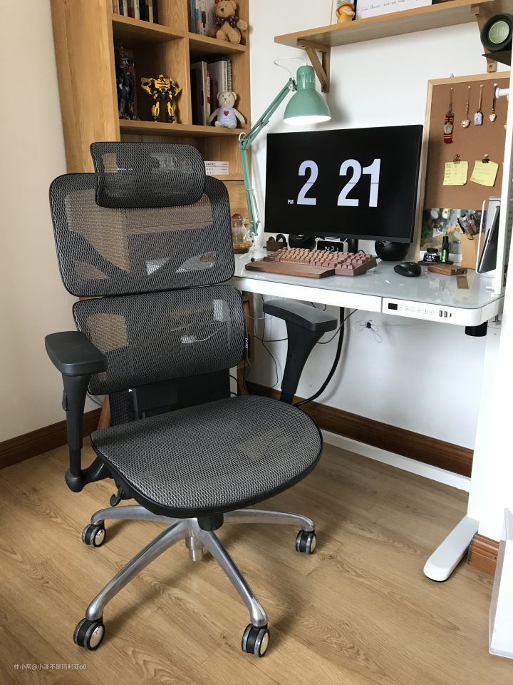 一平米左右的空间在左边摆放了书柜之后也就只能放得下一张120mm×60mm的书桌了,之前小泽用的是维莎原木的白橡木书桌,桌面距地面的高度为750mm。而电脑椅的最低高度为400mm,坐着码字时间久了颈椎和肩膀都会十分酸痛。