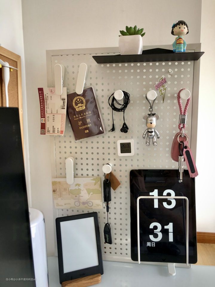 ▼由于宜家的洞洞板尺寸跟家里的墙面不搭,于是特意去马爸爸家淘了铁艺的洞洞板用来收纳一些零碎的小物件,洞洞板尺寸为400mm×600mm,上面的配件是在宜家购买的,使用之后还是非常美观而且整齐,将一些平时经常随手会用到的小物件放在洞洞板上进行收纳,随取随用,非常方便。