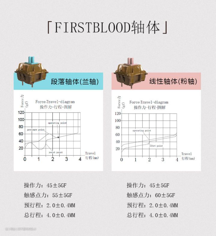 ▼FirstBlood兰轴的敲打体验不错,跟之前键盘的樱桃青轴相比,按压的时候都会有比较明显的段落感,敲起字来啪啪作响,区别是触发力度要比青轴轻很多,有点类似茶轴,初段没有很明显的反馈力度,更加适合平时码字时使用。
