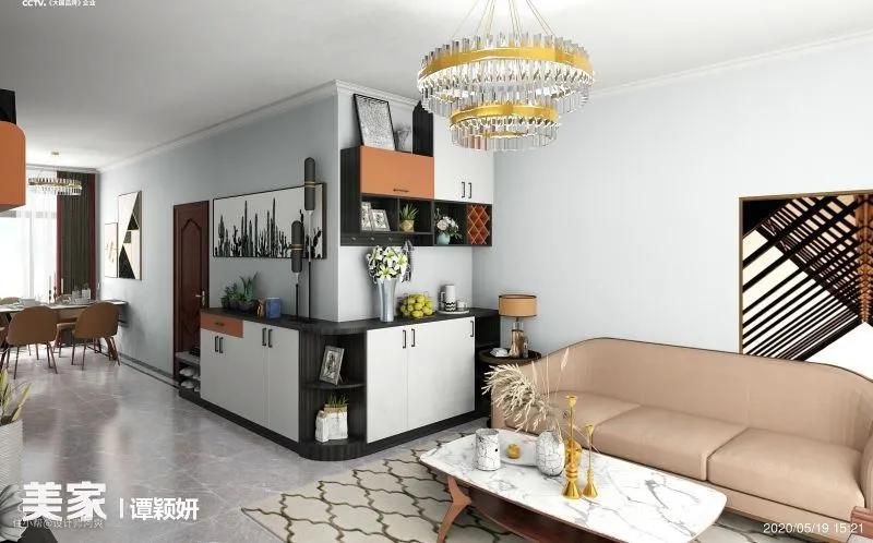 ▲转角是沙发背景墙的话,转角柜延伸至沙发处,方便平时随手放些物品,增加客厅收纳空间。