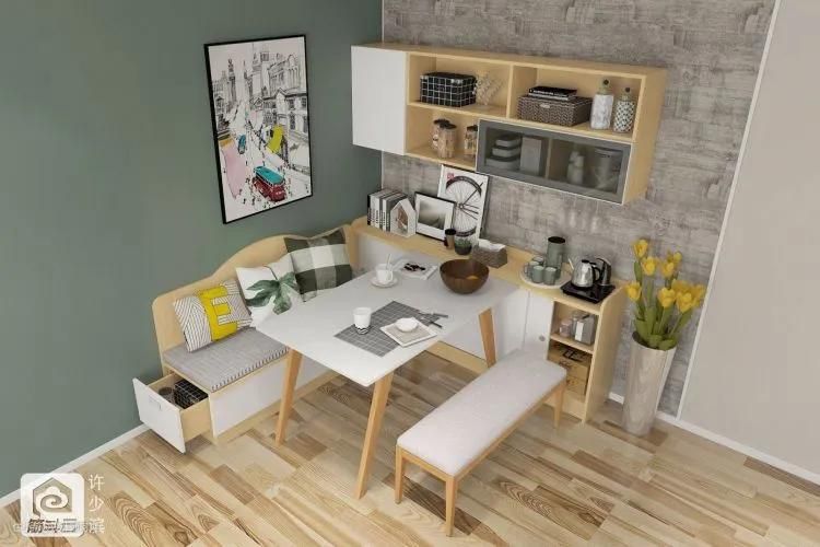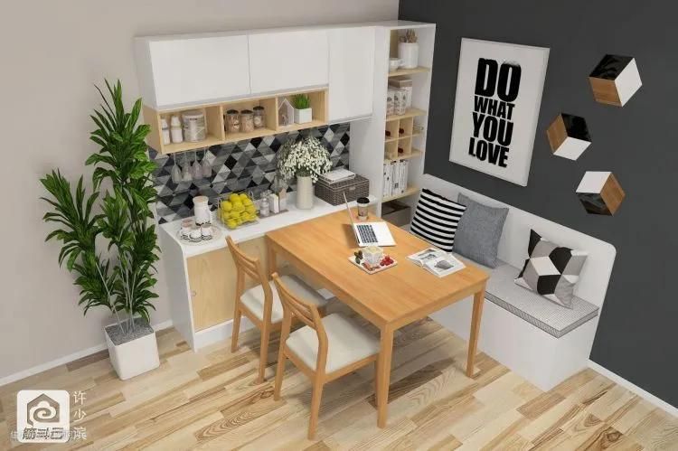 ▲角落设计一个卡座,可以解决餐厅过小、储物空间不足的问题,既增加了就餐位置,坐着也很舒服。