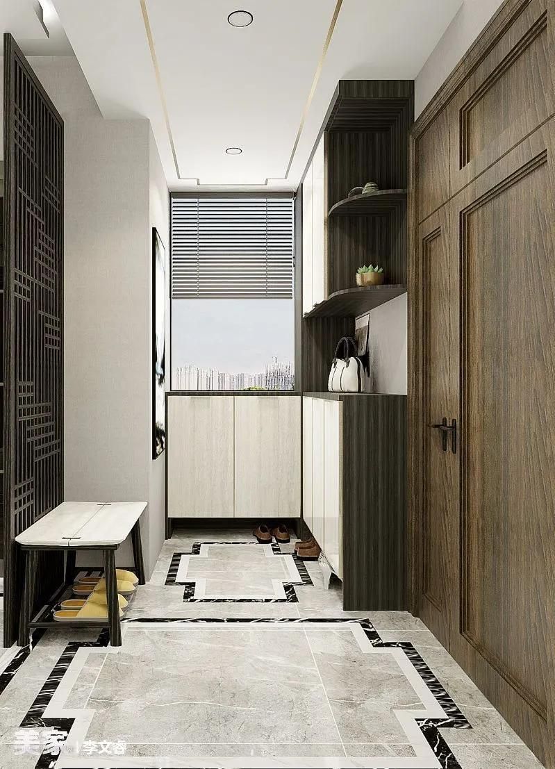 ▲如果你家的玄关有这样的转角凹位,靠墙打造到顶玄关柜,转角处连接一个矮柜,不遮挡窗户光线,收纳力也很强大。