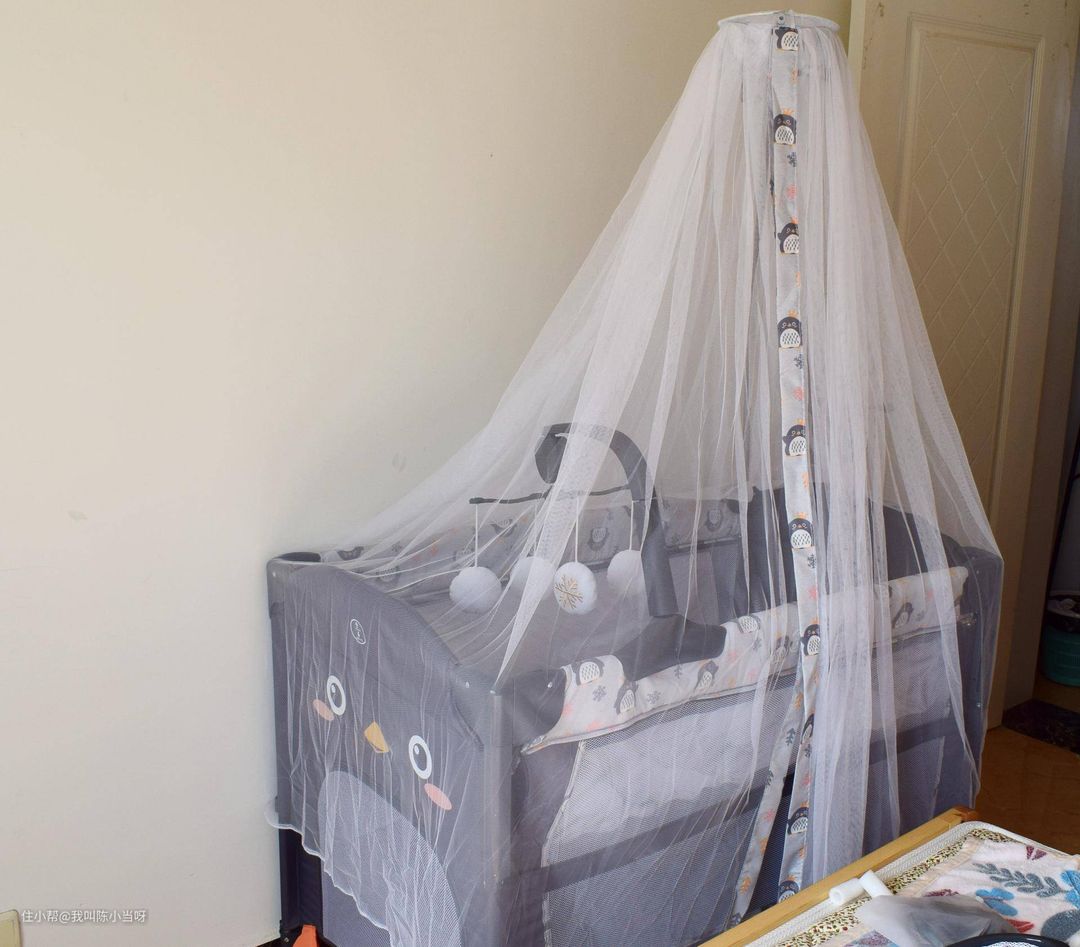 虽然已经立冬了,可是夜间偶尔还会有蚊子出现,这款婴儿床还高配了一个蚊帐——宫廷蚊帐,是不是很牛气!床角预留了一个蚊帐挑竿接口,白色的蚊帐就被挑起来了,让宝宝远离蚊虫叮咬,睡得安稳皮肤不痒。不过挑竿接口的地方蚊帐会堆积和蚊帐门没有扣子,觉得可以厂家改进,不过现在我们可以自己抽空做起来。