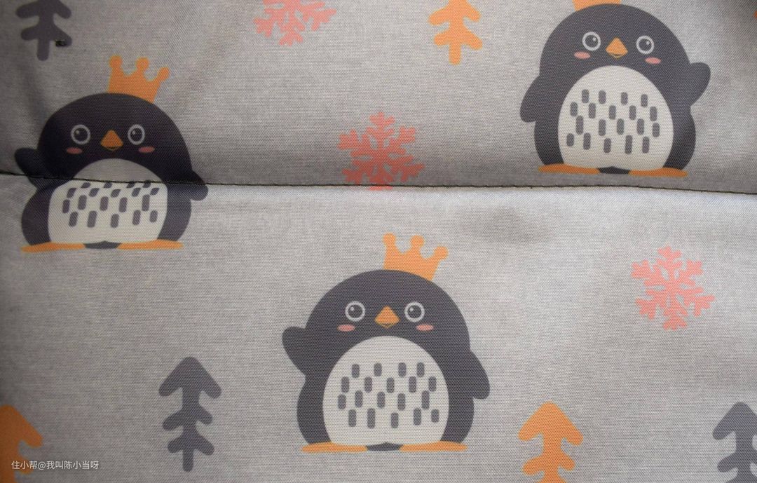 尿布台、围栏和床垫的衬布都是浅灰色,颜色低调,不给宝宝带来视觉上的压力,让宝宝在婴儿床中更安稳,布上印着小企鹅、雪花和小树,让沉稳中带着可爱。