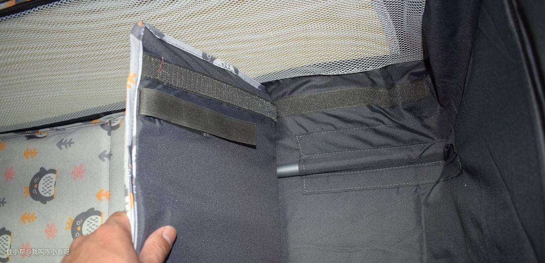 把支撑布的拉链拉好,对上魔术贴,支撑布安装到位。将四根支撑杆对接上,床板对上长条魔术贴铺好,那么婴儿床就安装完成。