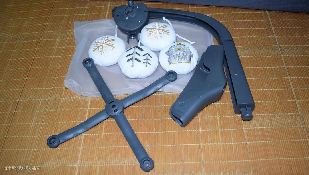 担心宝宝一个人躺着无聊哭闹怎么办?高配版附带的小纸盒里面有音乐铃组件,带发条的灰色心型发条音乐盒,稍微转动发条就能听到致爱丽丝的音乐。组件拼接还是蛮好玩的,好久没拼装积木了,动动手也是很开心的。4颗白色的布球分别印着雪花、小树和企鹅,不过宝宝已经三个多月了,这个布球的颜色可以丰富一些了,以后自己做几个吧。宝宝躺在里面盯着看小布球,不哭闹而且满脸的好奇。