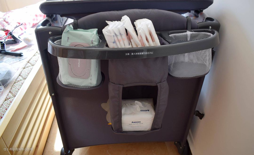 我选择的高配版还带了一个尿布台,拼好以后可以横着卡在婴儿床上,配合置物架,换尿布、做抚触不弯腰,减轻产后妈妈腰部压力,轻松带娃好帮手。担心宝宝在尿布台上乱动会掉下来?没关系,尿布台中间有安全带,可以扣起,防止宝宝滑落。